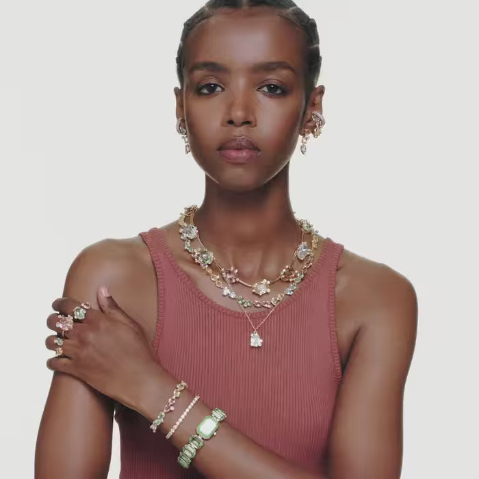 Con audaci colori e scintillanti riflessi di luce, questa collana girocollo Gema è una potente dichiarazione di gioia. Il design placcato in tonalità oro presenta una cascata di grandi cristalli in molteplici tonalità vivaci, accompagnati da cristalli più piccoli in una giocosa montatura a griffe a bolle. L’effetto è effervescente ed energico, regalandoti un gioiello che ti migliorerà l’umore per giornate davvero luminose