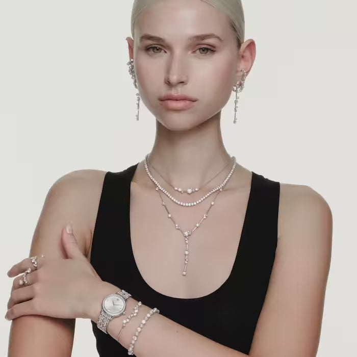Impreziosito da 232 singoli cristalli, questo scintillante orologio Imber è la massima espressione di intramontabile eleganza firmata Swarovski. Il design da 31 mm in acciaio inossidabile presenta una lunetta con pavé e 52 cristalli Cry montati a castone, mentre un ulteriore cristallo è posizionato all’interno della corona. Sul quadrante con motivo sunray, 11 cristalli di piccole e grandi dimensioni segnano le ore, insieme al logo cigno a ore 12. Intorno al polso, la caratteristica più distintiva dell’orologio è il bracciale regolabile a sette maglie, con 168 cristalli taglio Round splendidamente incastonati. Questo orologio Swiss Made è resistente all’acqua fino a 50 metri e si abbina perfettamente alla selezione di gioielli Imber di Swarovski.